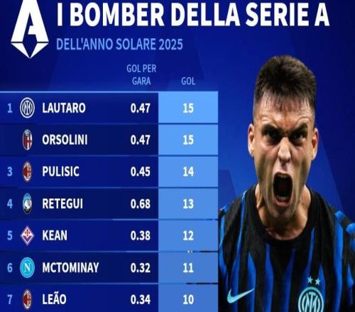 北京时间12月31日,德转列出了2025年意甲射手榜前10,劳塔罗和奥尔索利尼同以15球并列第一,普利希奇14球第三,麦克...