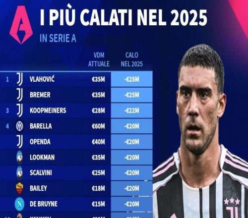 北京时间12月31日,德转列出了意甲2025年球员身价跌幅榜,尤文图斯包揽前三,弗拉霍维奇和布雷默下跌2500万欧元并...