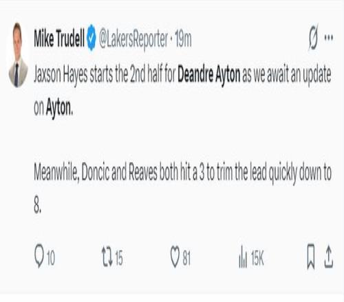 湖人队记迈克-特鲁戴尔:下半场艾顿没有先发也没有在替补席,正在等待官方消息。