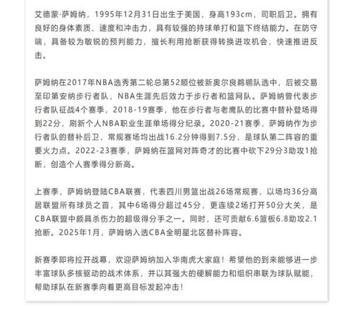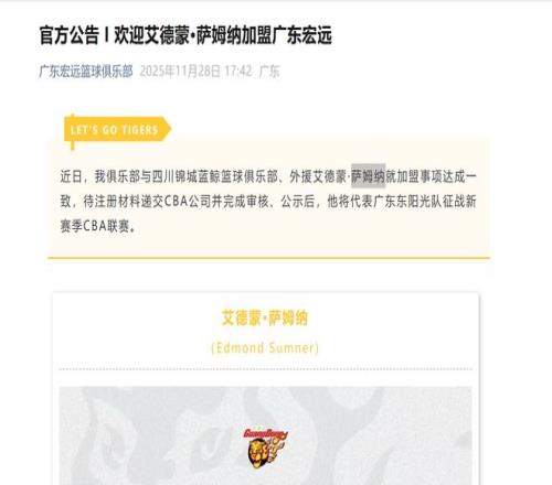 广东队官宣:萨姆纳加盟球迷:第12冠要来了